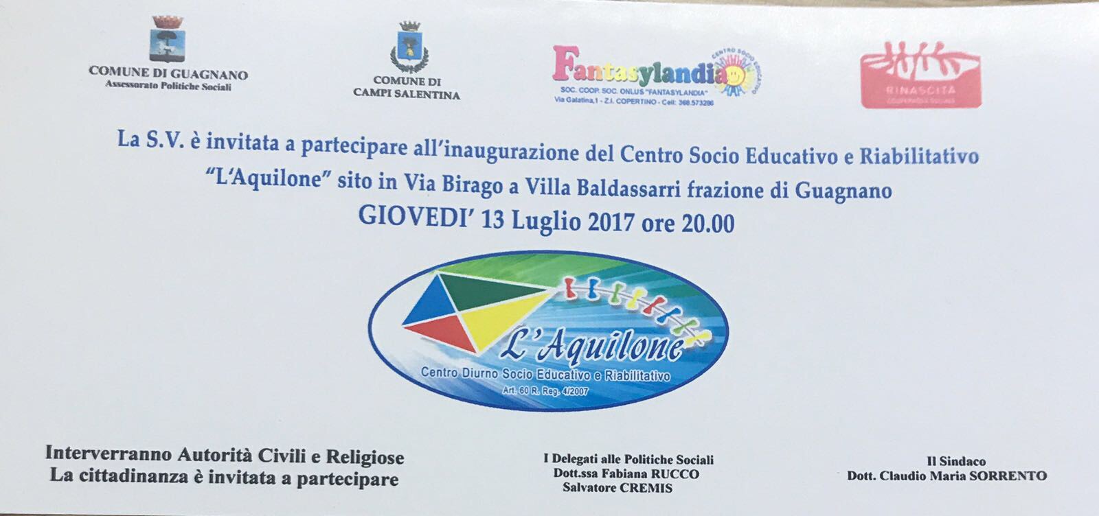 Giovedì 13 luglio alle ore 20:00 sarà inaugurato il Centro Diurno Socio Educativo e Riabilitativo denominato “L’Aquilone”, ubicato in via Birago a Guagnano nella Frazione Villa Baldassarri.