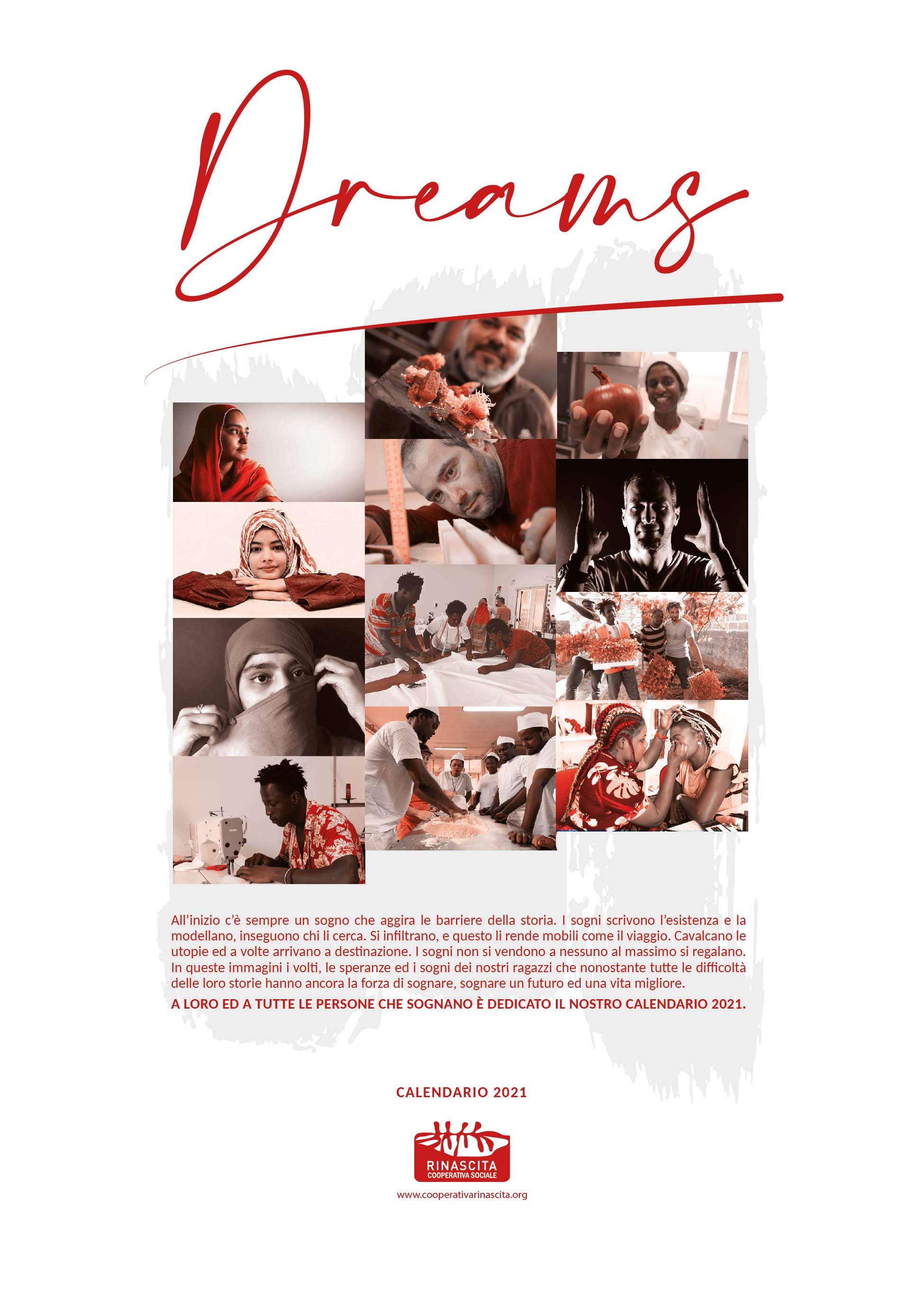 All’inizio c’è sempre un sogno che aggira le barriere della storia. I sogni scrivono l’esistenza e la modellano, inseguono chi li cerca. Si infiltrano, e questo li rende mobili come il viaggio. Cavalcano le utopie ed a volte arrivano a destinazione. I sogni non si vendono a nessuno al massimo si regalano. In queste immagini i volti, le speranze ed i sogni dei nostri ragazzi che nonostante tutte le difficoltà hanno ancora la forza di sognare, sognare un futuro ed una vita migliore. A loro ed a tutte le persone che sognano è dedicato il nostro calendario 2021.