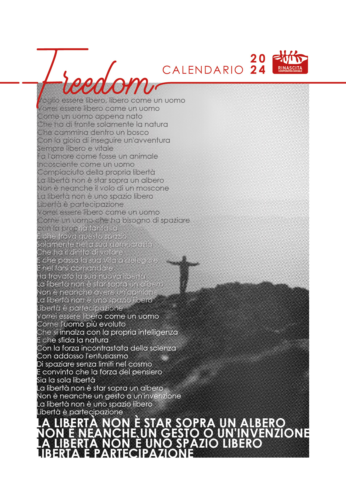 Anche quest’anno la Cooperativa Rinascita presenta il suo calendario. Il tema è quello della libertà, infatti il titolo del calendario 2024 è Freedom. Come prima pagina abbiamo scelto una delle canzoni più belle e rappresentative di Giorgio Gaber ricordando che la “libertà non è un gesto o un’ivenzione” ma soprattutto “partecipazione”. Con l’augurio che per il futuro le persone, tutte, abbiano la possibilità alla “partecipazione” vi facciamo i nostri migliori auguri di buon anno.