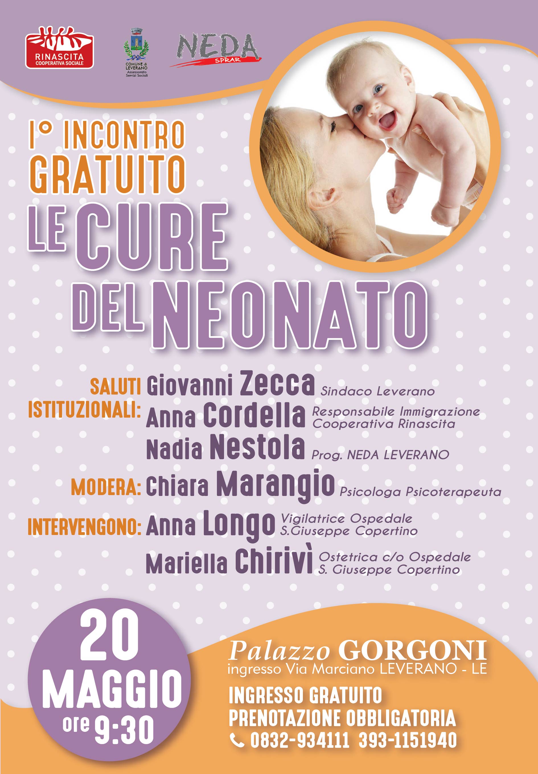 Venerdì 20 Maggio 2016, dalle ore 9.30 alle ore 12.30, a Leverano presso Palazzo Gorgoni (ingresso via Marciano) si terrà il Corso post-nascita intitolato “CURE DEL NEONATO”.
