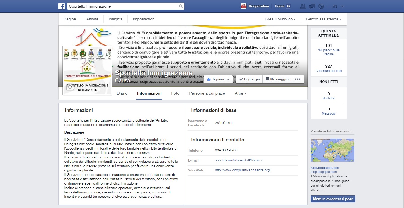 Lo Sportello Immigrazione, oltre ad avere una natura Itinerante nei comuni dell’Ambito, per garantire una completa accessibilità mediatica, ha creato ed attivato su Facebook la sua Pagina Ufficiale: “Sportello Immigrazione”; un servizio interattivo e veloce, capace di raggiungere quotidianamente centinaia di utenti, sia singoli, che account gestiti da Enti ed Amministrazioni.